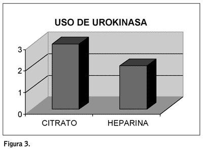 Los problemas respecto al flujo de sangre fueron similares en ambos grupos (2 casos en cada grupo) pero hay diferencia en el uso de urokinasa (figura 3).