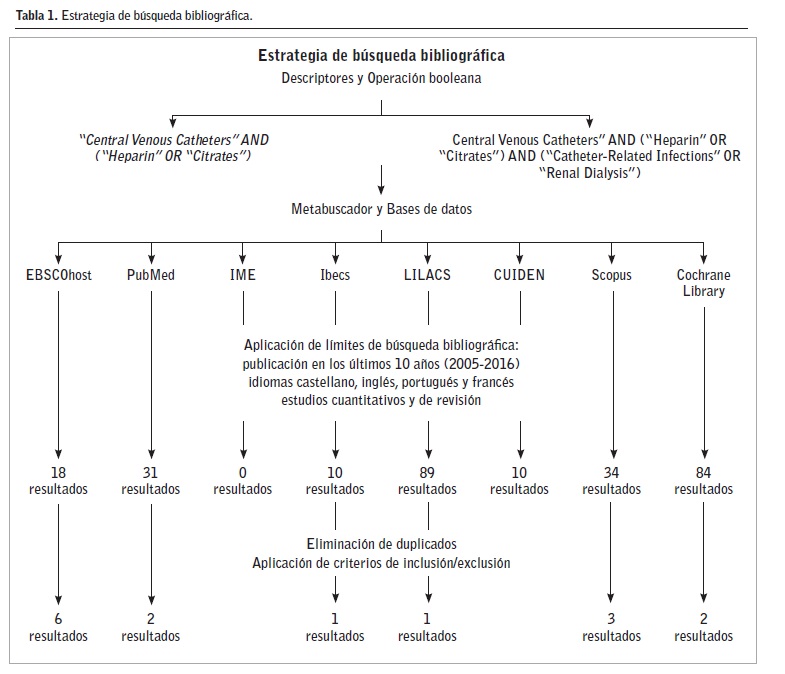 In the central venous catheter sealing on hemodialysis, does the use of citrate with respect to the use of heparin have less complications of infection? A review of the literature Abstract Introduction: Heparin is the standard anticoagulant drug commonly used in hemodialysis services for the permeabilization of central venous catheters. Although it has risks like bleeding. Catheter-associated infection, either by colonization of the catheter or bacteraemia, is the most important event and the second cause of mortality following cardiovascular disease in the hemodialysis patient. In this sense, citrate use is being presented as an alternative for central venous catheter sealing because it has both local and antimicrobial anticoagulant properties and could be more efficient in preventing or reducing catheter-associated infection. Objectives: To identify which sealing anticoagulant of the central venous catheter, heparin or citrate, presents less complications of catheter-associated bacteremia and colonization of the catheter. Material and Method: A bibliographic search was performed through the EBSCOhost (Academic Search Premier, CINAHL) and PubMed, IME, Ibecs, LILACS, CUIDEN, Scopus and Cochrane Library databases, with the final selection of 15 documents after the application of search limits, removal of duplicates and the application of the inclusion/exclusion criteria. The most relevant and current results available in the scientific literature showed some variability, both in anticoagulant concentrations and in the incidence of infection. Results and Discussion: Numerous evidence on catheter-associated bacteremia, both in relation to the concentration and the combination of the sealed anticoagulant, indicates that 4% citrate could reduce the incidence of bacteremia. However, antimicrobial-associated citrate is more effective in preventing bacteremia than sodium heparin or exclusive citrate. Conclusions: Although the use of exclusive sodium citrate does not present clear advantages in the complications of catheter-associated infection with sodium heparin, the benefits are shown at low (4%) or moderate (30%) concentrations, especially when combined with antibiotics. Even so, the association of citrate with antibiotics should be studied according to patient comorbidity, recurrence of infection and antibiotic resistance. Introducción En los últimos años, el número de pacientes con insuficiencia renal crónica ha aumentado y aproximadamente el 89% de éstos inician el tratamiento sustitutivo renal mediante hemodiálisis1. El acceso vascular de elección en hemodiálisis es la fístula arteriovenosa (FAV), a pesar de que un importante porcentaje de pacientes, entre el 15-50%, son portadores de catéteres venosos centrales de acceso central y tunelizado, principalmente yugular2-4. El uso del catéter venoso central (CVC) está orientado a la espera del acceso vascular tipo FAV, aunque ante dificultades en el estudio vascular puede ser de carácter definitivo4,5. Sin embargo, el uso de catéteres venosos centrales requiere medidas de esterilidad, asepsia e higiene, sin estar exento de riesgos, siendo las complicaciones asociadas más frecuentes la infección, la obstrucción y el bajo flujo intradiálisis por permeabilidad reducida del catéter4. De hecho, en la actualidad las recomendaciones norteamericanas y europeas indican limitar el uso de los catéteres para evitar el aumento de la morbimortalidad de los pacientes en hemodiálisis2,3,5. En este sentido, dichas complicaciones suponen un incremento de los costes sanitarios, por ingreso hospitalario, recolocación del catéter o recambio del catéter entre otros, siendo la infección asociada al catéter (IA-CVC), bien por colonización del catéter o por bacteriemia, el evento más importante y la segunda causa de mortalidad tras la enfermedad cardiovascular2,6-8. El origen de la infección más frecuente en los CVC es la colonización endoluminal producida por manipulación a través de las conexiones externas, siendo otras causas la colonización extraluminal producida por migración de la flora cutánea a través del trayecto cutáneo de fibrina, la vía hematógena desde otro punto de infección o la contaminación de los líquidos de infusión2. El 75% de las muertes en pacientes en hemodiálisis son causadas por bacteriemia, y es el acceso vascular la principal vía de entrada de ésta, con un riesgo relativo de mortalidad 1,5 veces mayor y un riesgo relativo de infección 7,6 veces mayor en el uso de CVC respecto a los pacientes con FAV2,6-8. Es por ello, que en el manejo de los catéteres venosos centrales en la práctica clínica cobran especial importancia los anticoagulantes utilizados en la permeabilización o el sellado del catéter4. En relación a ello, el fármaco de elección y de uso habitual en los servicios de hemodiálisis ha sido la heparina7, a pesar de que la literatura científica indica la existencia de una falta de consenso científico basado en la evidencia sobre el procedimiento de sellado y los volúmenes y las concentraciones de heparina9-11. A ello se suma que el uso de este anticoagulante se asocia a una mayor incidencia de eventos adversos de trombocitopenia y hemorragia10,11. En los últimos años, el uso del citrato se está presentando como una alternativa para el sellado de los catéteres venosos centrales, dado que tiene propiedades tanto anticoagulantes locales como antibmicrobianas, que a priori apuntan a una asunción de menores riesgos respecto al uso de la heparina3,9,11,12. De este modo, podría tratarse de una solución que además de cumplir con los requisitos de biocompatibilidad, baja toxicidad, actividad anticoagulante y acción antimicrobiana, puede garantizar menores riesgos para la seguridad del paciente. Por todo ello, a continuación se presenta una revisión y síntesis de la evidencia más actual y disponible existente en la literatura científica, realizada con el fin de respond