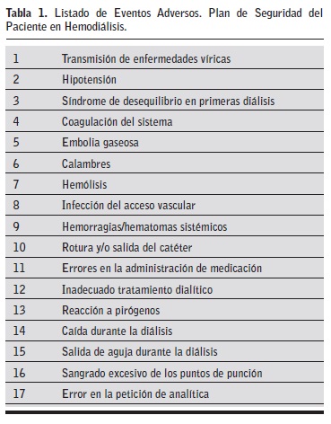 Resumen Los pacientes en hemodiálisis son una población susceptible de padecer eventos adversos por fallos en el proceso asistencial. Objetivo: Evaluar la eficacia de las medidas correctoras en un plan de seguridad del paciente en hemodiálisis para disminuir los eventos adversos. Material y Método: Estudio descriptivo y retrospectivo del registro de hemodiálisis de una unidad hospitalaria. Como método de evaluación se utilizó la metodología propia de nuestro centro (MIDEA) basado en el método Global Trigger Tools. Se revisaron todas las sesiones de hemodiálisis de marzo, mayo y julio de 2016: 2.080 sesiones; y los mismos meses en 2017: 1953 sesiones. Después del análisis de 2016, se implantaron las siguientes medidas correctoras: revisión del procedimiento de anticoagulación del circuito extracorpóreo, actualización del manejo de los accesos vasculares y actualización del procedimiento ante hipotensiones. Resultados: En el año 2016, se revisaron las gráficas de 208 pacientes. Se detectaron 255 eventos adversos (11,8% de las sesiones), siendo los más frecuentes: 85 hipotensiones, 74 coagulaciones del circuito sanguíneo, 31 problemas del acceso vascular y 65 otros eventos adversos. En el año 2017, se revisaron las gráficas de 258 pacientes. Se detectaron 155 eventos adversos (7,9% de las sesiones), siendo los más frecuentes: 60 hipotensiones, 36 coagulaciones del circuito, 30 problemas del acceso vascular y 29 otros eventos adversos. Conclusiones: Los eventos adversos disminuyeron un 39,2% en 2017, y aunque siguen siendo las hipotensiones, coagulaciones del circuito sanguíneo y los problemas derivados del acceso vascular los más frecuentes, pensamos que las medidas correctoras están siendo eficaces. PALABRAS CLAVE: seguridad del paciente; evento adverso, hemodiálisis. Analysis of corrective measures for reducing adverse events in a hospital dialysis unit Abstract Patients on hemodialysis (HD) are a population susceptible to suffering adverse events (AD) due to failures in the healthcare process. Objective: To evaluate the efficacy of corrective measures in a HD patient safety plan to reduce AD. Material and Method: Descriptive and retrospective study of the HD records of a hospital unit. As an evaluation method, we used the methodology of our center (MIDEA) based on the Global Trigger Tools method. All the HD sessions of March, May and July 2016 were reviewed: 2,080 sessions; and the same months in 2017: 1953 sessions. After the 2016 analysis, the following corrective measures were implemented: revision of the anticoagulation procedure of the extracorporeal circuit, updating of the vascular access management and updating of the procedure before hypotension. Results: In 2016, the clinical records of 208 patients were reviewed. 255 EA were detected (11.8% of the sessions). The most frequent AEs were: 85 hypotension, 74 blood circuit coagulations, 31 vascular access problems and 65 other AD. In 2017, the clinical records of 258 patients were reviewed. 155 AE were detected (in 7.9% of the sessions). The most frequent AEs were: 60 hypotension, 36 circuit coagulations, 30 vascular access problems and 29 other AE. Conclusions: Adverse events decreased by 39.2% in 2017, and although hypotension, blood circuit coagulation and vascular access problems are the most frequent, we consider that corrective measures are being effective. KEYWORDS: safety; hemodialysis; adverse event.