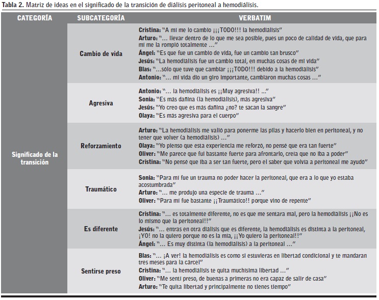“Dejé de salir a caminar porque cansaba, ¡¡Mucho!! ¡¡Mucho!!, de hecho, mi vida era de moverme mucho de aquí para allá y entonces pues, ¡Nada!, tuve que dejarlo (eleva los hombros como gesto de conformidad) …” (Entrevista Antonio: 170) Los cambios físicos en el cuerpo determinaron alteraciones en la imagen corporal y surgieron respuestas de miedo, dolor y respeto ante el catéter venoso central, en contraposición a la normalidad asignada al catéter peritoneal. “…lo del cuello (catéter de hemodiálisis) me daba más respeto, ¡No sé!, tenía miedo que me saliera y ponerme a sangrar…en cambio con el de peritoneal ¡No! como está en la tripa...” (Entrevista Sonia: 112) Se manifestó una identidad de enfermo, ya que se sintieron más enfermos en HD porque tomaron más conciencia de su enfermedad renal. “Me costó entrar en hemodiálisis, porqué me sentí un enfermo de verdad, cuando yo en peritoneal no me noto enfermo, allí (hemodiálisis) ves a gente que está muy malina y piensas que a ti te va a pasar lo mismo, es como que tomas más conciencia de todo …“ (Entrevista Ángel: 75) Se produjeron modificaciones en las necesidades básicas como la dieta, el aseo, la actividad física, o el sueño. Tener que seguir un régimen de alimentación acorde con los requisitos de la HD limitó el ritmo de vida habitual porque supuso reducir vida social. “… porque esto (la hemodiálisis), ¡Claro!, (chasquido con la lengua) con la restricción de líquidos sales menos, y luego los demás, pues toman un vino, una cañita, y tú estás, que ni un vaso de agua, a un café corto, porque el líquido tiene que ser poco, entonces, dejas de salir por eso…” (Entrevista Olaya: 92) Aprender a ducharse con un catéter que, ni se puede mojar ni se puede curar, despertó la intranquilidad e impotencia de los participantes que estaban acostumbrados a ejercer su autocuidado, alimentando la sensación de pérdida de control sobre el cuerpo y emergiendo la dependencia respecto a los profesionales. “… pero con el otro (catéter de hemodiálisis) no es lo mismo, porque no me dejaban curarlo, ¡¡Jo!! entonces tenía que tener cuidado de no mojarlo y eso era un rollo, ¡Hombre! te ponen un plástico para que no entre el agua, pero ¡Da igual!, ¡No es lo mismo! … ya no tienes la misma tranquilidad” (Entrevista Antonio: 54) La restricción de actividades se consideró el factor más limitante en el día a día, y el cual tuvo una fuerte relación con la idea de cansancio que expresaron. “… apenas salía de casa porque me notaba un poco cansado…” (Entrevista Antonio: 130) Asimismo, la calidad del sueño empeoró en HD en relación a cuando tenían asignado el turno de la noche para dializarse. “Ibas de noche, con lo cual ya no dormías, ni dormías allí ni dormías en casa cuando llegabas” (Entrevista Arturo: 34) El nerviosismo se manifestó como el principal cambio que repercutió en la psique de los participantes, y el cual se avivó por la inmovilidad física que había que mantener durante la conexión a la máquina. “Yo es que el enfrentarme a que tenía que estar tres horas y media acostada, inmóvil, no sé por qué me entraba tanto nerviosismo y nunca les decía nada a los profesionales, pero yo estaba fatal …intentaba mentalizarme, pero no lo lograba” (Entrevista Cristina: 97) No obstante, destacó el cambio de carácter por no estar en la diálisis deseada y elegida, refirmándose el sentimiento de no sentirse identificados con la nueva terapia, tal y como reveló la siguiente evidencia. “La diálisis te cambia el carácter, ¡¡Muchísimo!!, aquella la de la sangre (hemodiálisis), a mí me cambió más todavía, porque no era la mía” (Entrevista Blas: 296) La vida social tornó un significado diferente durante la transición, la pérdida de libertad que manifestaron se trasladó a otro tipo de pérdidas y limitaciones que cohibieron la vida diaria de los participantes. “Dejé de hacer cosas, lo primero dejé de ir a caminar por las mañanas porque me notaba muy flojo, no podía con el alma, y luego que yo iba en turno de tarde, y la mañana no me daba tiempo, entre que me levantaba tarde porque estaba cansando y que me venía a buscar la ambulancia, ya no tenía tiempo de nada, y al día siguiente descansaba ¡sí!, pero no me apetecía” (Entrevista Oliver: 200) Las actividades sociales se estancaron y surgió un contacto social limitado, bien por el cansancio o apatía que provenían de las sesiones, o bien por las restricciones dietéticas que generaron falta de energía en el cuerpo. “Nosotros (esposa y paciente) a veces solemos salir a cenar, pero cuando estuve en hemodiálisis dejamos de hacerlo … entre que me notaba algo cansando y tampoco podía comer ni beber como en peritoneal, pues nada, no solíamos ¡Pa qué! ya no era lo mismo” (Entrevista Ángel: 82) Se exteriorizó una identidad de enfermo social cuando se dieron cuenta de que su entorno podía identificarles como un ser enfermo, lo que coincidió con el rol que sentían que debían asumir en HD. “… no se siente uno a un nivel así de los demás, de ser una persona normal, de pronto caes en otro status, ¡No puedes!, estás limitado de todo, y estás como apenado, uno se apena porque tienes miedo a que los demás vayan a sentir pena de uno, ¡¡Vaya!!, una cosa que psicológicamente golpea muy fuerte …” (Entrevista Oliver: 30) No obstante, encontraron un buen apoyo entre los profesionales que les atendían en HD, y con otros pacientes que se dializaban en la sala. “Haces amistades, porque son muchas horas las que estás allí, además te sientes como un poco más arropado, al principio piensas que sólo eres tú y hasta que no entras allí (sala de hemodiálisis), no te das cuenta de lo que hay (silencio), y vas conociendo a más gente que tiene tú mismo problema” (Entrevista Ángel: 115) Muchos factores que impactaron en su mundo social también afect