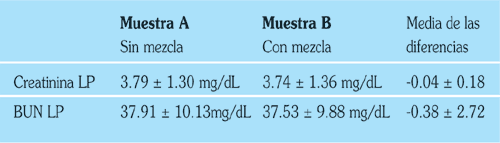 en lo últimos 3 meses. A los enfermos se les instruía para la obtención de dos muestras del efluente peritoneal. Una primera muestra del contenido de la garrafa antes (Muestra A: sin mezcla) y después de agitar bien (Muestra B: con mezcla) todo el contenido con cualquier utensilio alargado. El cálculo del volumen del efluente se obtuvo mediante la suma del volumen infundido, el drenaje inicial, la ultrafiltración total nocturna, las ultrafiltraciones diurnas y el volumen de cebado y de vaciado de bolsas a la garrafa que no pasaban por el peritoneo. Las muestras de sangre se han obtenido siempre entre 1-2 horas después de finalizar el tratamiento con la cicladora. Las determinaciones de urea y creatinina se realizaron en un autoanalizador mediante las técnicas de ureasa ultravioleta y de jaffé cinético, respectivamente. Se calculó el KT/V y el CLCr/1.73 m2 semanal peritoneal y total (incluyendo la función renal residual), utilizando el paquete estadístico de PD-ADEQUEST® 2.0. Se transformó la urea en nitrógeno ureico en sangre (BUN). Los cálculos se han realizado utilizando el paquete estadístico SPSS para Windows versión 11.5. Se han expresando los resultados como media y desviación estándar y se ha realizado una estadística básica descriptiva, analizando las diferencias de cada dato apareado. RESULTADOS Se han realizado un total de 25 estudios en 13 pacientes, 8 varones, con una edad media de 46.58 años, desde 21 a 75 años, y un tiempo medio de permanencia en DP de 26.62 meses, desde 6 a 72 meses. De los 13 enfermos, 4 realizaban DPA con día seco y otros 4 enfermos realizaban 1 o 2 intercambios diurnos. Seis enfermos no tenían función renal residual. Tres enfermos en DPA no se incluyeron en el estudio por problemas de inestabilidad clínica. En la tabla 1 se expresan los resultados de urea y creatinina en las muestras A y B, antes y después de agitar el contenido de la garrafa del efluente peritoneal. En 15 casos la creatinina fue igual, en 7 casos fue inferior y en 3 superior antes que después de remover. Para la urea encontramos que en 6 casos no se modificó, en 5 casos fue superior y en 14 inferior antes de remover.
