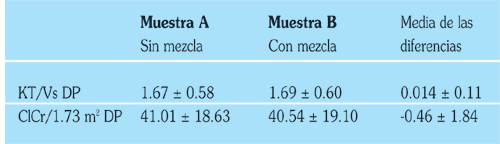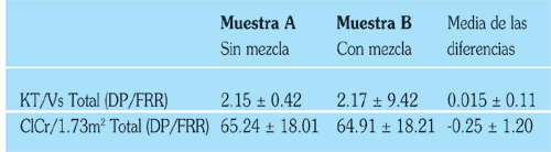 En general no se observaron diferencias apreciables entre las dos muestras, tanto para la creatinina como para la urea. En ningún caso la diferencia observada entre los dos resultados superaba al coeficiente de variabilidad de la técnica de determinación para la creatinina y la urea de nuestro laboratorio. Al obtener resultados a simple vista tan similares no hemos realizado ninguna prueba estadística. En la tabla 2 se expresan los resultados obtenidos para el cálculo de la dosis de diálisis con las dos muestras, considerando sólo lo aportado por la Diálisis Peritoneal.